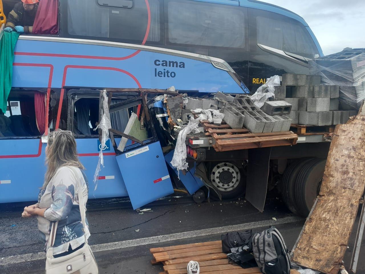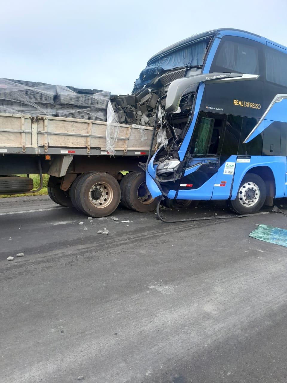 Imagens registradas por testemunhas, mostram a parte frontal do ônibus completamente destruída e a carga espalhada pela pista. Ao todo 29 passageiros estavam dentro do ônibus. 10 sofreram ferimentos leves e um deles foi socorrido em estado grave pela equipe de resgate e 19 saíram ilesos. O motorista ficou preso entre as ferragens e foi retirado por agentes do Corpo de Bombeiros apenas com ferimentos leves. Ambos foram levados para um hospital da região.