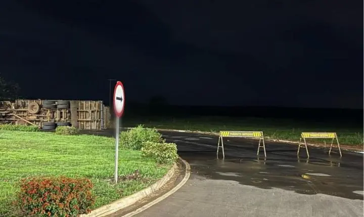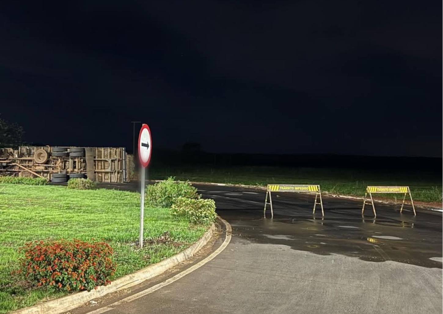 Um caminhão carregado com papelão tombou em uma rotatória próximo a creche Professora Enoi dos Santos Assis, em Guará, na região de Franca.