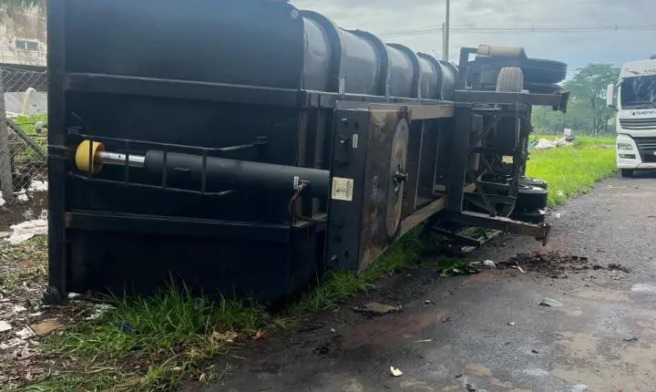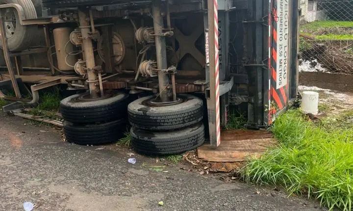 Um caminhão carregado com um composto químico conhecido como ureia, tombou na rua Ademar Pulicano, no Distrito Industrial, em Franca.