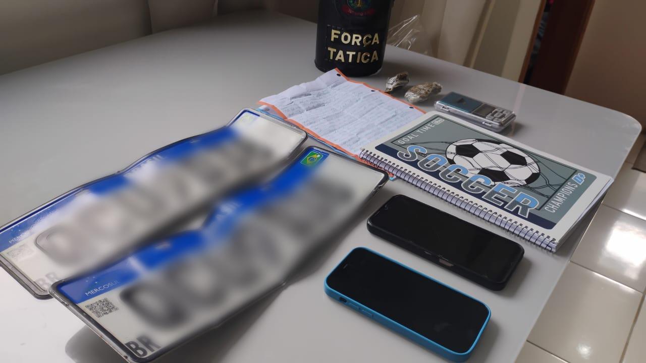 Segundo informações da Polícia Militar, as equipes se deslocaram para uma residência localizada no bairro Colina do Espraiado, na zona sul da cidade, para cumprir mandado de busca e apreensão e prisão temporária. Dentro do apartamento estavam o homem investigado, sua esposa e a enteada. No guarda-roupas do quarto foram encontradas duas porções de maconha, uma balança de precisão, um caderno com anotações e duas correspondências. Os policiais também apreenderam dois aparelhos celulares e duas placas de automóveis, que pertenciam a um veículo Strada furtado na cidade de Franca no último dia 29 de setembro. O veículo foi encontrado estacionado na vaga do apartamento do homem investigado.