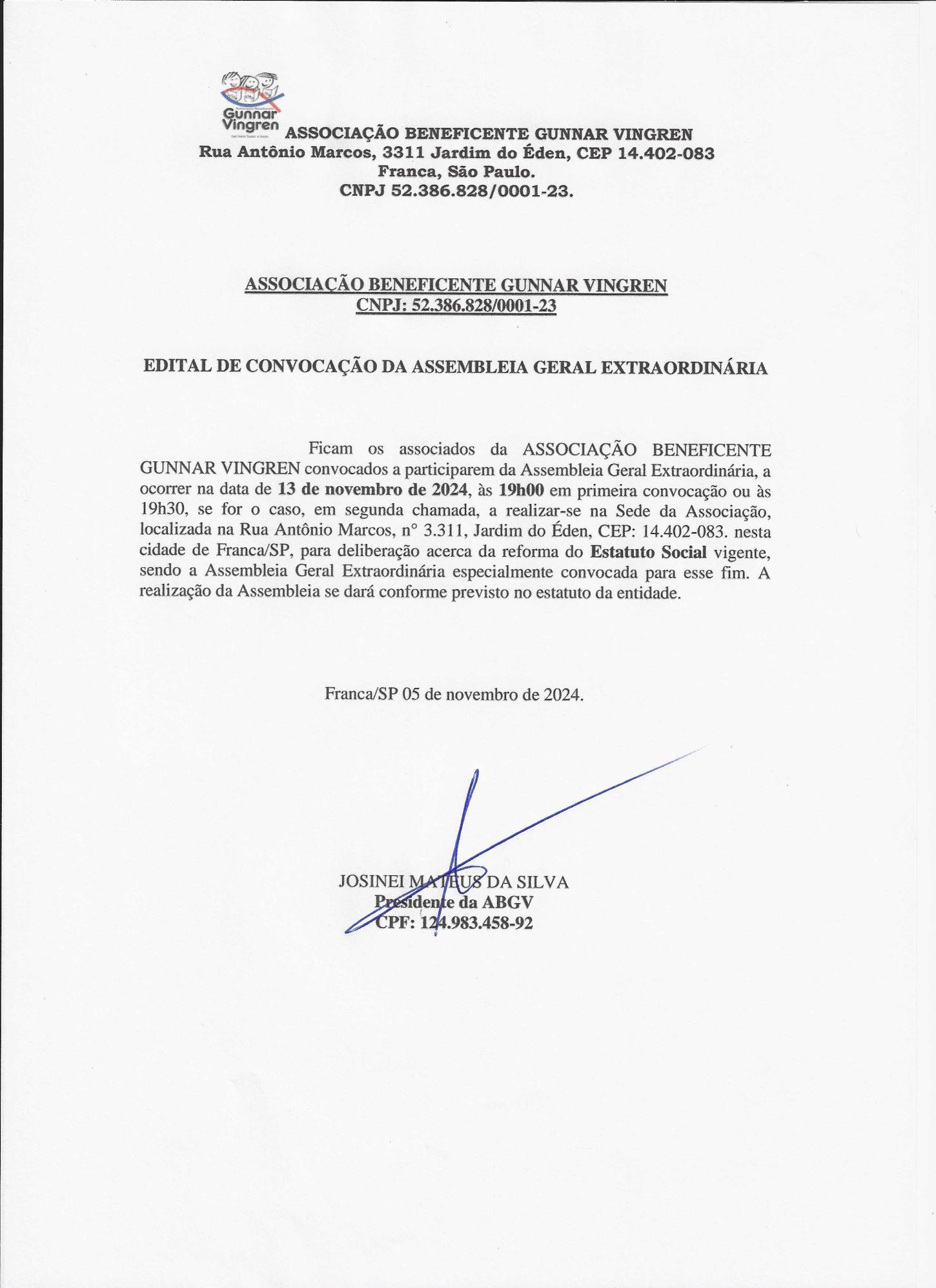 Edital de convocação da Associação Beneficente Gunnar Vingren