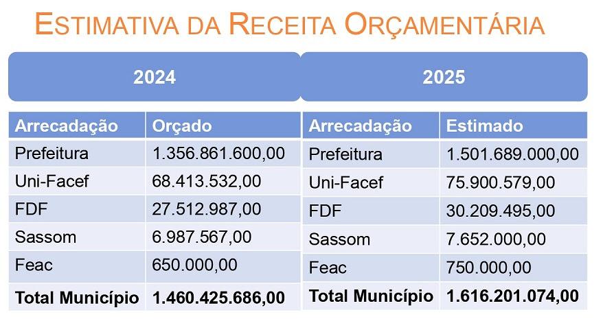 De acordo com o projeto a previsão do orçamento para 2025 é de R$ 1.616.201.074,00 (um bilhão, seiscentos e dezesseis milhões, duzentos e um mil, setenta e quatro reais).