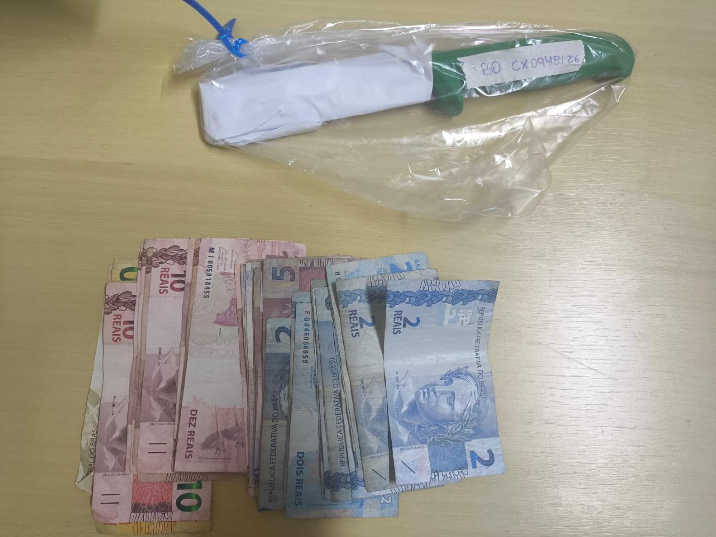 Segundo informações da Polícia Militar, o criminoso foi localizado enquanto populares corriam atrás dele pela rua Rio Branco. O homem foi abordado próximo a uma residência e, com ele, foram encontrados uma faca, um capuz e a quantia de R$ 251,00 em dinheiro, subtraída mediante ação violenta.