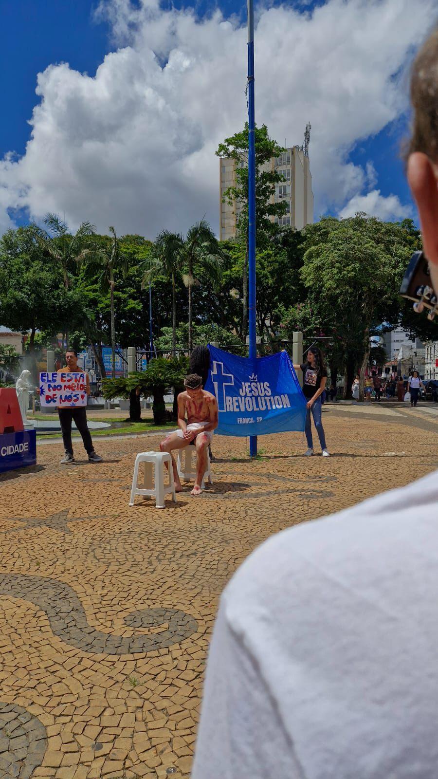 Segundo a coordenadora do movimento Jesus Revolution, Aléxia Gianna, de 23 anos, a encenação teve como objetivo impactar o público presente nas principais praças do Centro. Ao todo, 23 membros do movimento caminharam rezando ao redor de um dos coordenadores do grupo, que estava vestido de Jesus Cristo e com a representação das marcas das agressões sofridas antes de ser colocado na cruz.