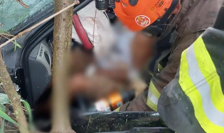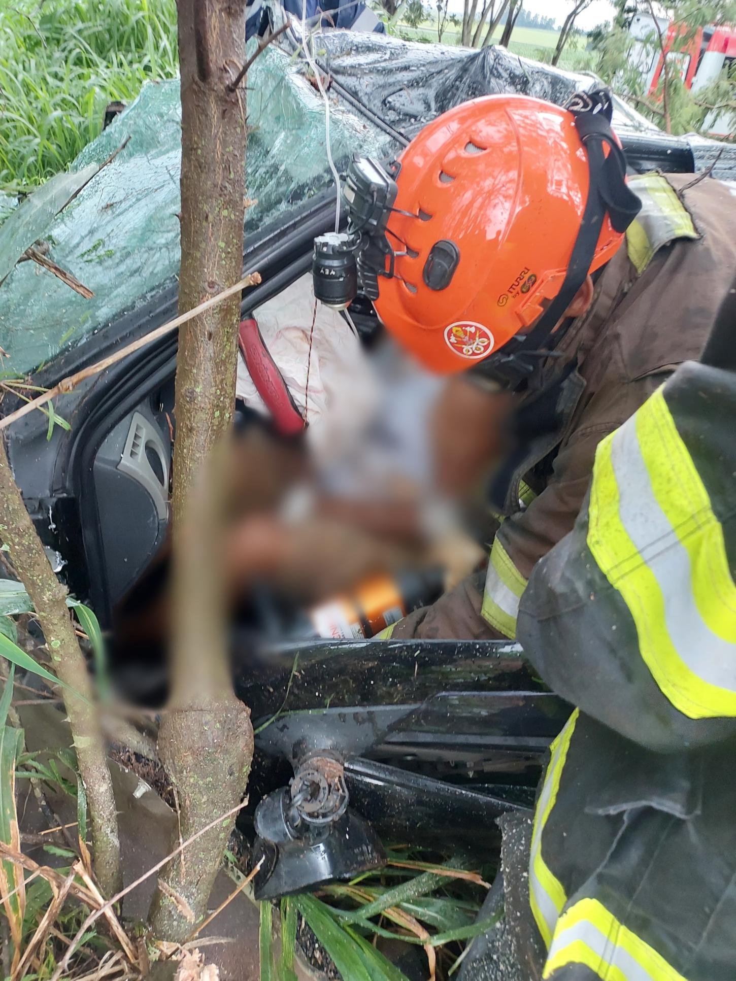 Segundo informações do Corpo de Bombeiros, o motorista de um veículo Palio perdeu o controle da direção, saiu da pista e bateu em uma árvore numa área de mata.