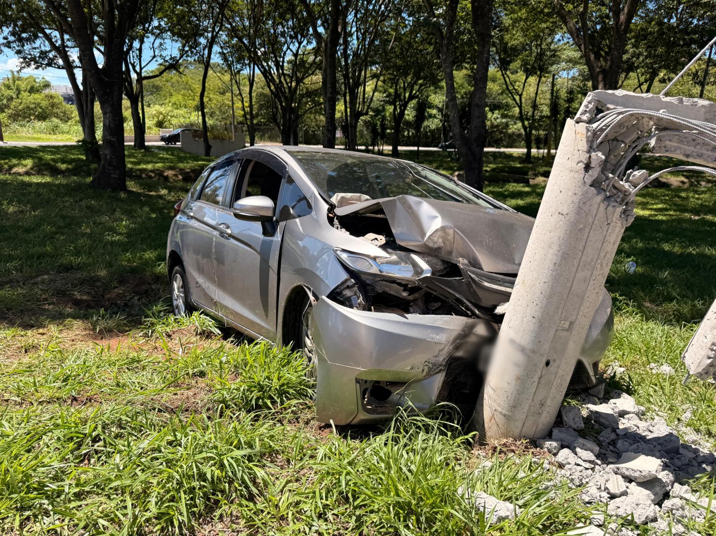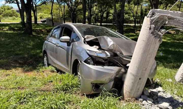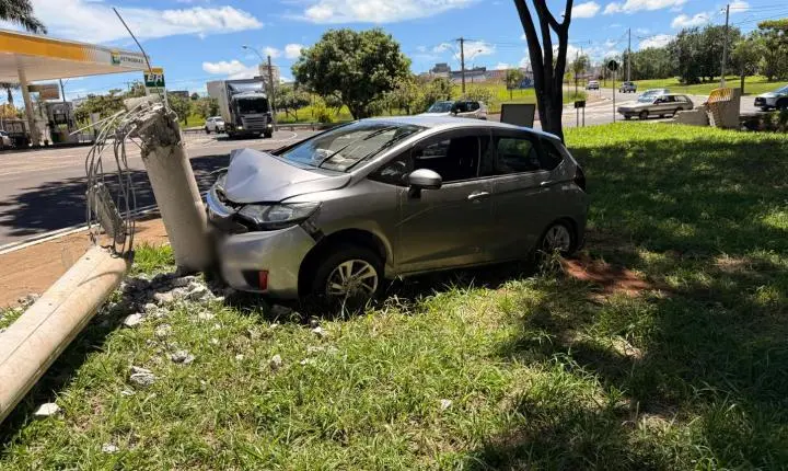 Uma pessoa que dirigia um carro, sentido ao Centro, perdeu o controle da direção, subiu na calçada de uma rotatória, bateu em um poste e parou na vegetação a poucos metros do córrego Cubatão, próximo ao condomínio Franca Garden.