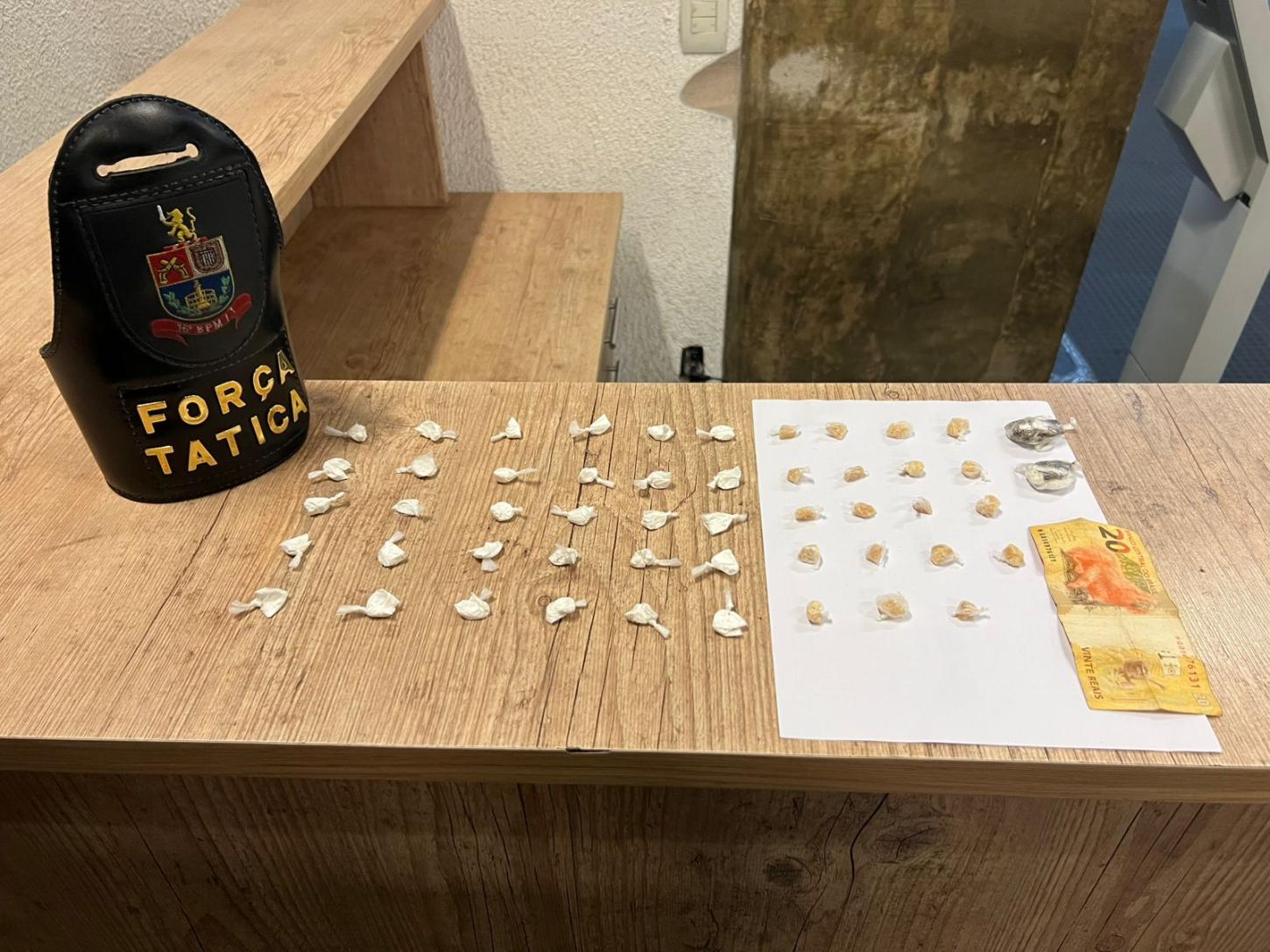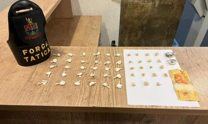 Os policias faziam patrulhamento pelo bairro, quando viram uma possível venda de entorpecentes. Ao notar a viatura, o traficante tentou fugir, mas foi detido com cocaína, crack, maconha e R$ 20.