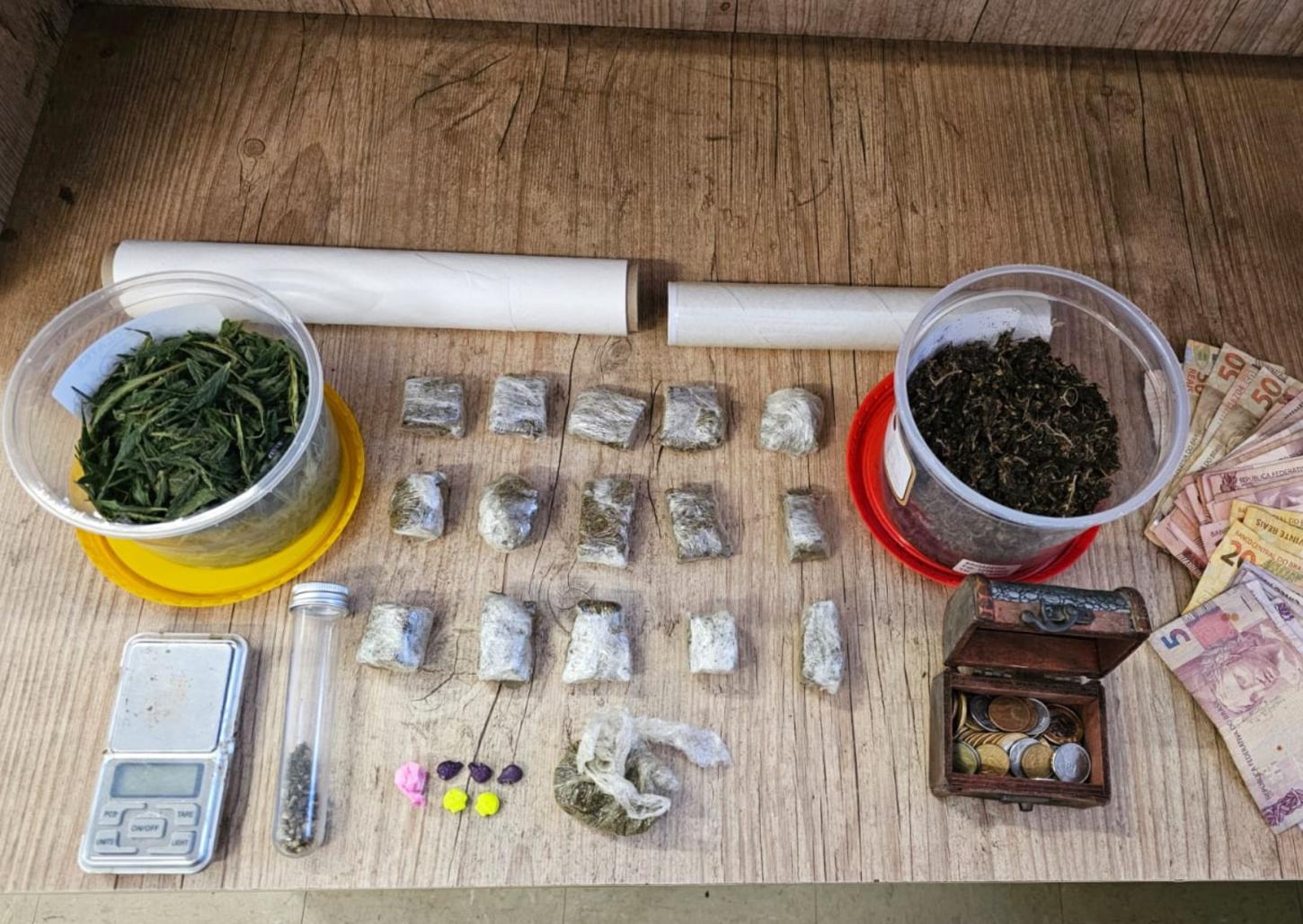 Segundo informações da PM, o indivíduo foi abordado e tentou empreender fuga, mais foi detido pelos policiais. A equipe foi até a casa do procurado e encontrou diversos pés de maconha, drogas, aparelho celular e uma quantia em dinheiro.